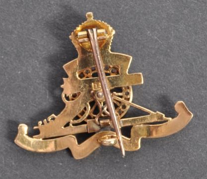 A rare WWII Second World War related 18ct gold (stamped ' 18 ') Royal Artillery sweetheart's brooch. The front inset with blue, green and red enamel decoration. The Artillery gun wheel inset with CZ's. A fine gold example. Total weight 6.8g.
