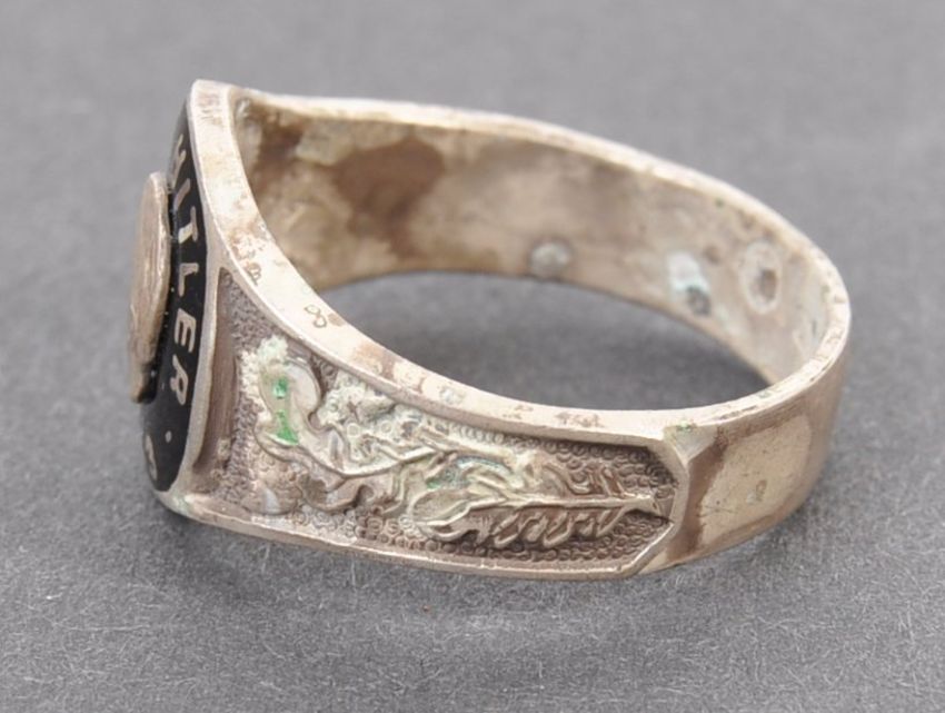 A WWII Second World War related Third Reich Nazi German NSDAP ring, the enamel facia depicting a bust of Adolf Hitler, with text and dated 1933. White metal construction, with faint makers marks to the inside. Fantasy piece.