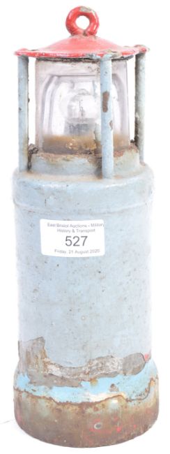 An unusual WWII Second World War interest Oldham Electric Lamp - in unusual blue and red colour scheme, likely that of admiralty / naval use. Lacking the base, but retaining the original glass section to top, with original bulb. Measures approx; 25cm tall.Provenance; purchased by the vendor in Normandy where it was said to have been found at Sword Beach some time after the D-Day landings. The vendor believes it to have been used as some form of signalling lamp