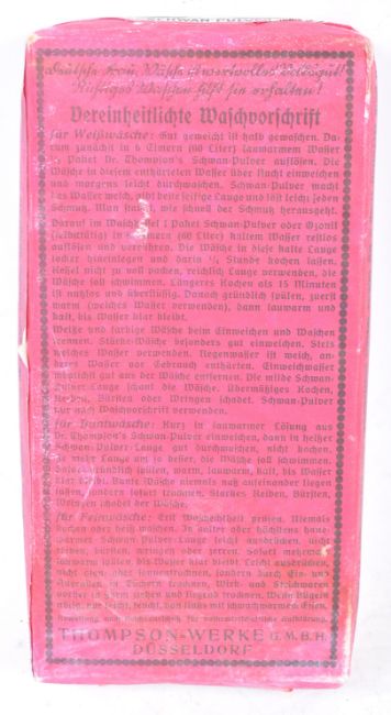 Two boxes of unused WWII Second World War Third Reich Nazi German soap flakes. The first being ' Dr. Thompson's ' the other ' Perflor '. Both boxes sealed and unused, with various advertising notation to front. Rare items from the period. Each approx; 20cm tall.