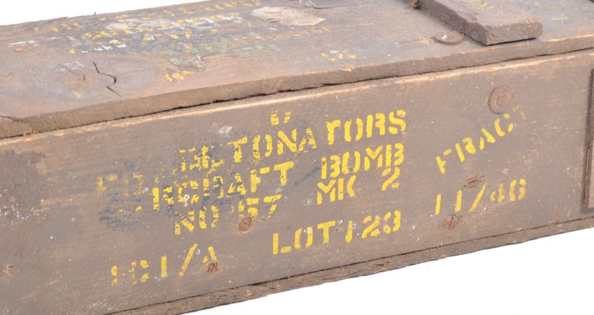 An original WWII Second World War British Army wooden ammunition case / box. Used to store aircraft bomb detonators, the ammo box retains its original finish. Dated 1946 to the front. Wire carry handles to the side and metal hinges to secure the lid. A good example.