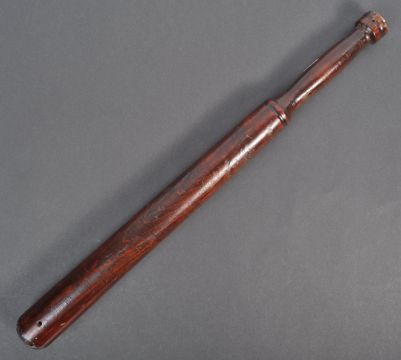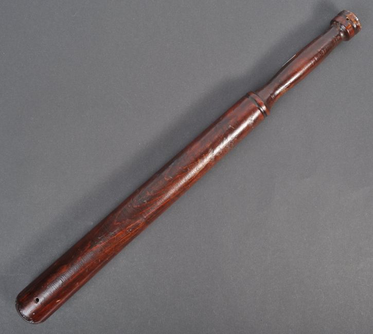 A 19th Century Victorian English antique Police baton bat nightstick. Wooden example with tapering bat end, turned handles, wooden holes to either end and a lacquered finish. A great early example of policing equipment. Measures: 55cm long.