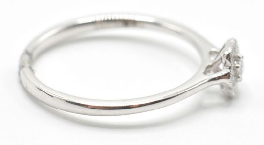 An 18ct white gold ladies dress ring in the shape of a flower having a central diamond set within a halo of diamonds. Weighs 1.5g. Ring size K.