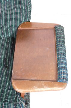 A vintage retro Danish Influenced 1970's sofa bed / settee having a wooden frame with rail backrest with folding armrests to create a bed, the seat pads being upholstered in green striped fabric, all raised on tapering splayed supports. Measures 85 x 120 x 60cm.