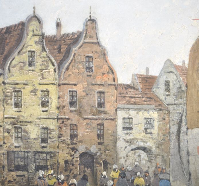 A 19th Century Dutch School antique oil on canvas painting depicting a coastal town / dock scene with figures shopping, rows of buildings and ships on a calm quays waters. Set to a period ornate gilt frame. Measures: 72cm x 97cm.