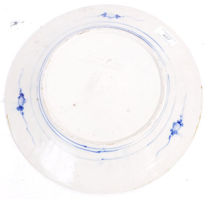 A pair of 19th Century Chinese / Japanese antique porcelain chargers / plates having hand painted blue and white decoration depicting Phoenix among blooming floral sprays. Impressed character marks to verso. Measures: 30cm wide. Condition: Some wear to bases, one has small restoration to rim. Overall good examples.