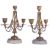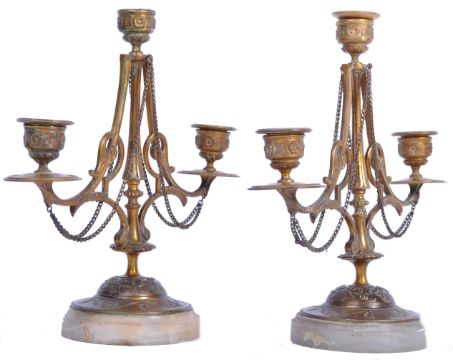 A pair of 19th Century French antique bronze candelabra / candlesticks. Triple sconce examples with central column flanked by scrollwork and chains. Raised on circular marble bases. Measures: 25cm tall.