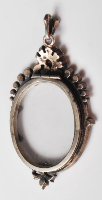 A late 19th / early 20th Century silver pendant locket of oval form having a frame set with round paste stones and glazed panel to the centre with a hinge opening to the verso, and paste set bale to the top. Stamped 925 to verso. Weight 15g. Measures 6.5cm high.