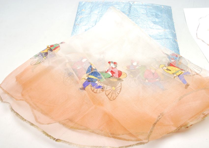 A group of vintage mid 20th Century Japanese prints on fabric depicting people ladies in kimonos being pulled in wheeled carts printed sections with gilt borders.