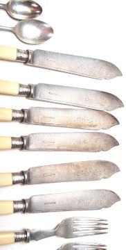A group of seven antique and vintage silver spoons to include having a handle engraved Rachel Clare, a teaspoon with a crossed golf club design terminal, two cruet spoons etc. all being hallmarked, together with a group of Walker and Hall ivorine handled cutlery to include fish knives and forks ea being silver collared. Spoons weigh 53.1g.