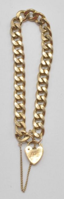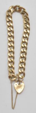 A hallmarked 9ct gold flat link bracelet with a heart lock and safety chain. Hallmarked London 1994. Weight 10.6g. Chain measures approx. 7 inches.