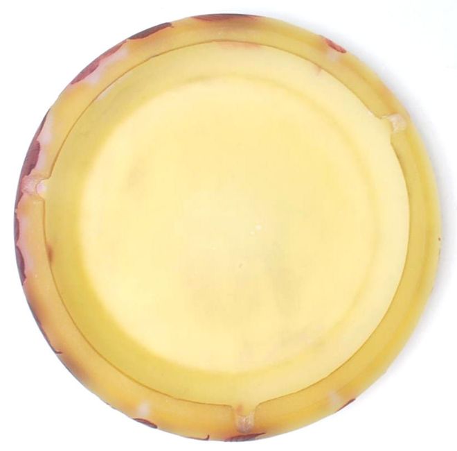 A 19th century French glass dish in the manner of Legras signed Tip. Of squat form with amber frosted glass having a hand painted leaf finish navigating the edge of the bowl.