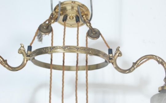 A good 20th century Dutch brass light in a manner of a 18th  century chandelier having two scrolled decorated arms with scallop shaped glass shades.