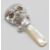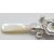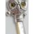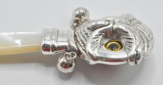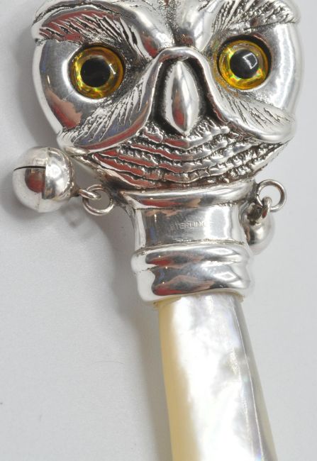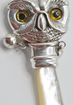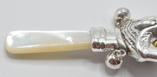 A silver babies / childs rattle in the form of an owl with yellow and black glass eyes having a mother of pearl handle. Weight 14g. Measures 7cm long.