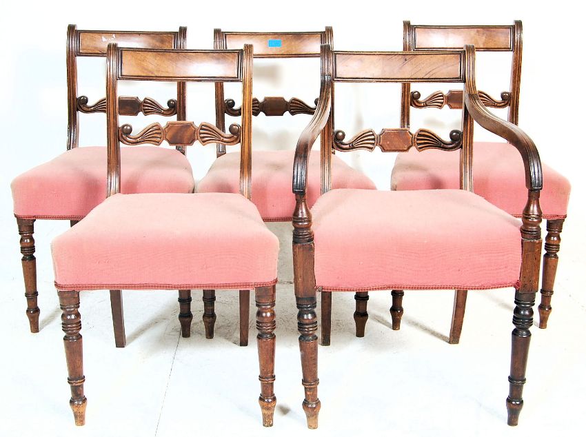 A set of 19th Century Regency mahogany bar back dining chairs to include four dining chairs and one carver. The chairs having carved back splats under bar back rests. The armchair rests with shaped elbow rests. All having red upholstered seat pads and raised on turned and tapering front legs. Measures 85 x 53 x 42 cm