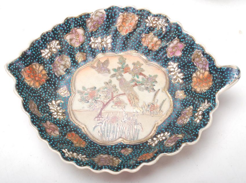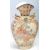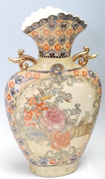 A group of 20th Century Japanese Satsuma ceramics to include a large vase with scalloped rim and twin gilded handles, decorated with flowers and  raised paint to the body, a pair of japanese candlesticks with single sconce and square tapered stem, Japanese dish and bowl all in the same Satsuma pattern and decoration. Most with six character marks to the bases.