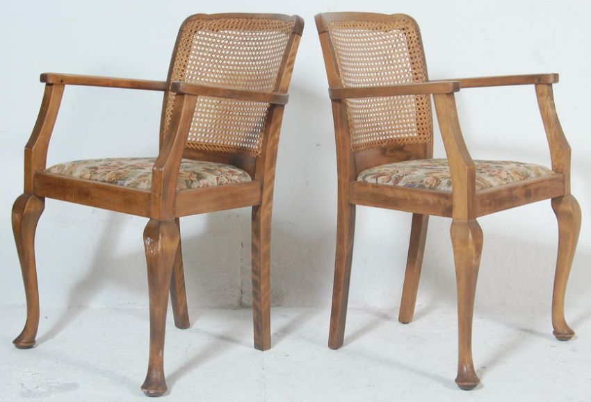 A pair of 20th century carver chairs by P.E. GANE Ltd house furniture, College Green, Bristol. Having padded seats with curved rattan / cane backrest, shaped armrest and supports. Measures 86 x 54 x 52cm.
