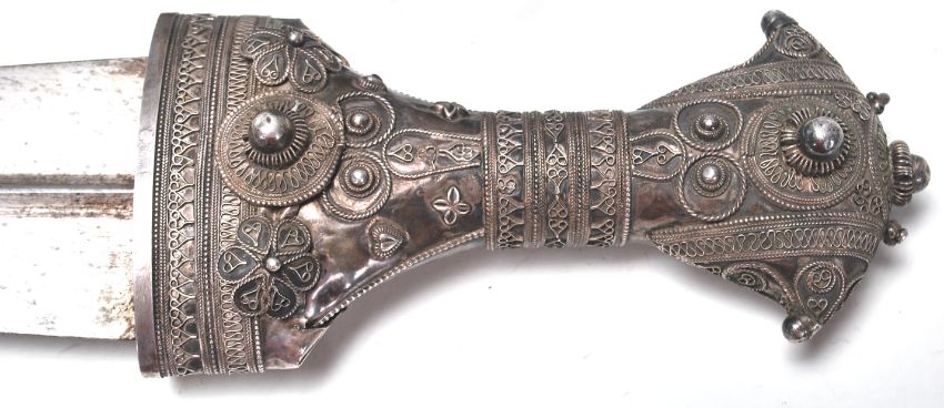 An early 20th Century Islamic white metal curved dagger / jambiya having a short curved blade with a central ridge which is seated in its original and highly decorated scabbard. Measures 35cm long.