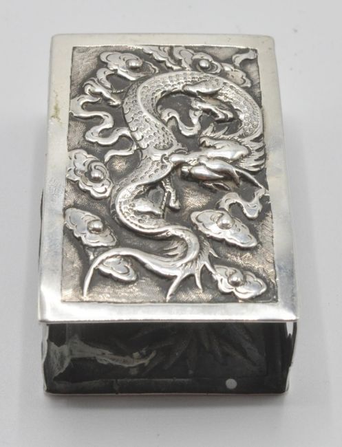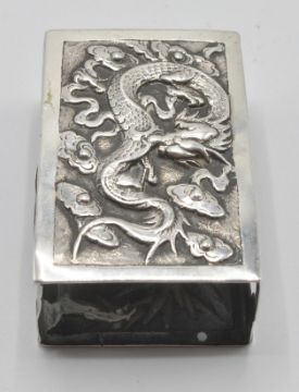 A good 20th century continental silver hallmarked matchbox holder having dragon decoration to one side and bamboo decoration to the other side. Illegible hallmarks. Weight 29.9g