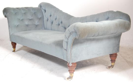 A Victorian 19th century double scroll end chesterfield sofa settee / chaise longue. Raised on turned mahogany legs with an overstuffed button backed frame with blue velour fabric.
