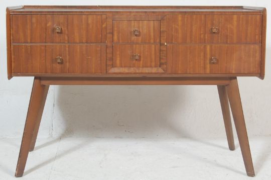 A retro mid century, Danish influenced walnut chest of drawers. Raised on tapering angular legs with a series of 6 short and long drawers having knob pull handles. The top with raised chamfered gallery edges. Measures 77 cm high x 114 cm wide x 46 cm deep.