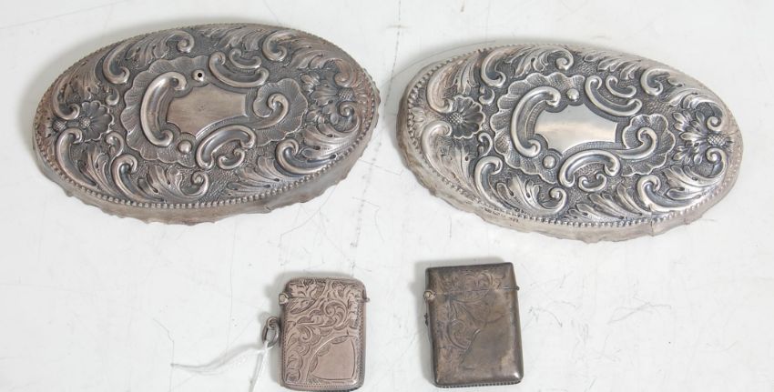 A pair of silver hallmark vesta cases having engraving decorations to the body, hinged lid, Birmingham silver hallmarks, letter date f 1905, makers mark for J G Joseph Gloster and date D 1903, makers mark for S&B (Smith & Bartlam) along with two silver brush covers hallmarked Birmingham dated P 1889-1890 S.W.S ( Samuel Walton smith) Total weight: 126g