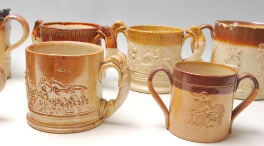 A large quantity of 19th century Royal Doulton Lambeth stoneware to include cups, jugs and loving cups, having the typical raised decoration with hunting and tavern scenes, greyhound shaped handles and two tone salt and brown glaze. Height measures 17cm.