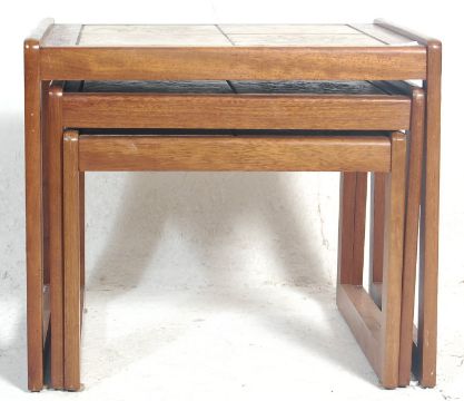A retro vintage 1960s Danish inspired teak wood graduating nest of tables in the manner of G Plan having four square tiles with floral decoration raised on quadrille shaped legs. Measures 48 cm high x 54 cm wide x 46 cm deep.