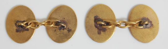 A group of three vintage gentleman's boxed cufflinks and studs to include a pair of silver mother of pearl and blue stone cufflinks housed within a R. B. Ashcroft box, a pair of yellow metal oval cufflinks with engraved scrolled decoration set within a Kendal & Dent box and a set of three collar studs set with round agate cabochons. All boxed with original tooled leatherette boxes.