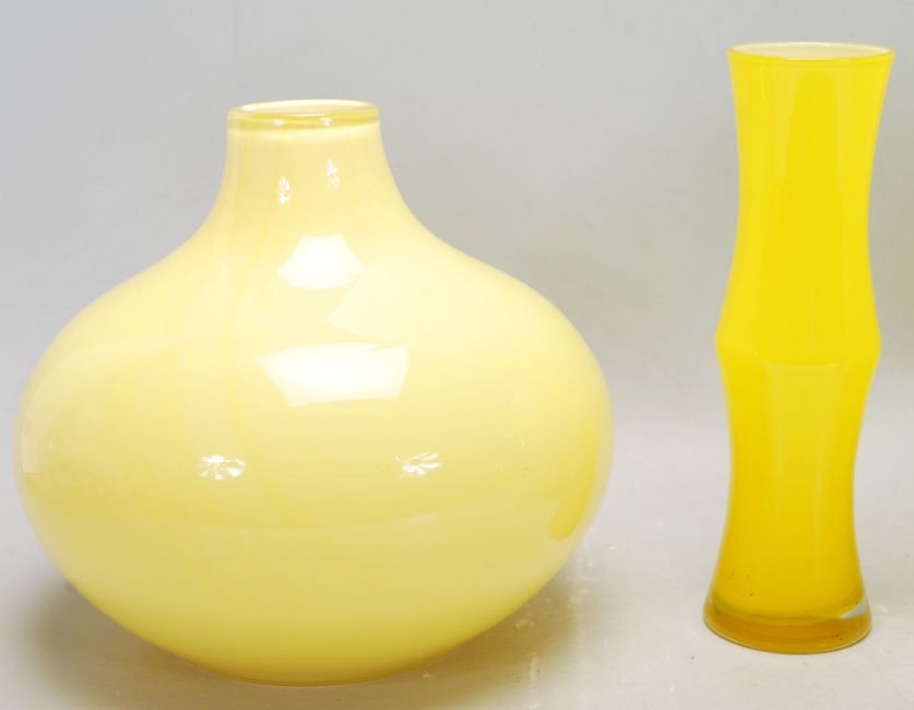 A mixed collection of retro vintage late 20th Century studio art glass ware in canary yellow to include a waisted neck vase, flared rim vase, a gourd shaped vase, a ribbed vase and many others.
