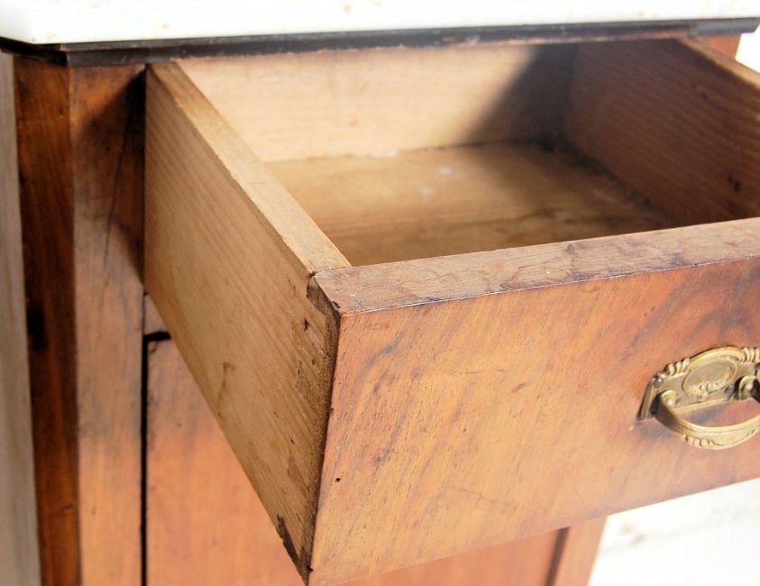 A pair of early 20th Century French Oak bedside cabinets. One having a marble top over a drawer upon a single door cupboard with a shelved interior raised on bun feet together with a another cabinet having a marble top over a single door cabinet raised on reeded tapering legs. Measures 80 cm high x 42 cm wide x 33 cm deep.