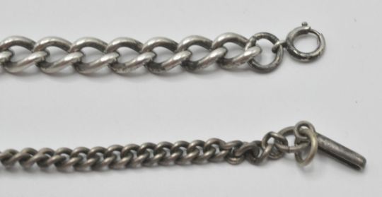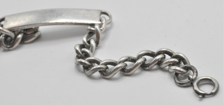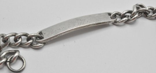 A silver hallmarked flat link / gentleman's ling curb identity bracelet having Birmingham silver hallmarks date Z 1974, makers mark D&BS together with a sterling silver identity tag and chain. Weight 37g