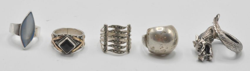 A group of five silver rings to include a stamped 925 silver Chinese dragon ring in the form of a coiled dragon, a silver ring set with a blue navette shaped mother of pearl panel, a domed head ring, a marcasite set ring and a ring set with a black stone with gilt decoration. All markes as silver or test as silver. Weight 36.5g.