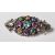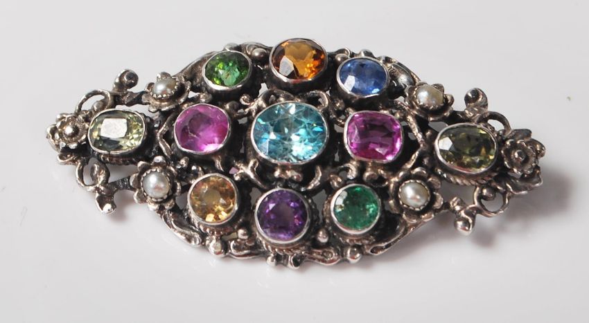 An early 20th Century silver gem set brooch being set with pink and blue sapphires, zircon, amethyst, citrine, pearl etc. All within a pierced and scrolled floral mount, with a hinge pin to the verso. Weight 12g. Measures 5.2 cm wide.