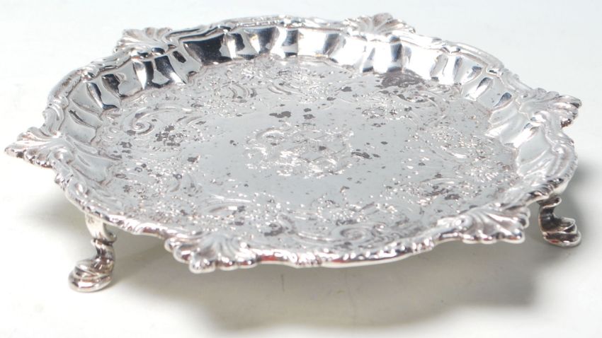 A George II silver hallmarked salver of circular form with scalloped edge being raised on hoof feet. Hallmarked for London, makers William Peaston, date letter P for 1750. Total weight 282.94g