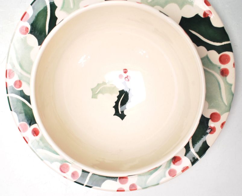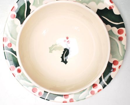 A late 20th Century ceramic tea cup and saucer by Emma Bridgewater in the Holly pattern decorated in green and red. Makers stamp to the base.