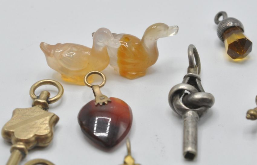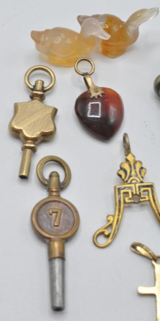 A collection of vintage pendants and related items to include a Chinese green stone pendant set with white stones, a heart shaped red stone pendant, a silver mechanical toothpick, pocket watch keys, two carved stone duck ornaments, a hammer charm with mother of pearl handle.