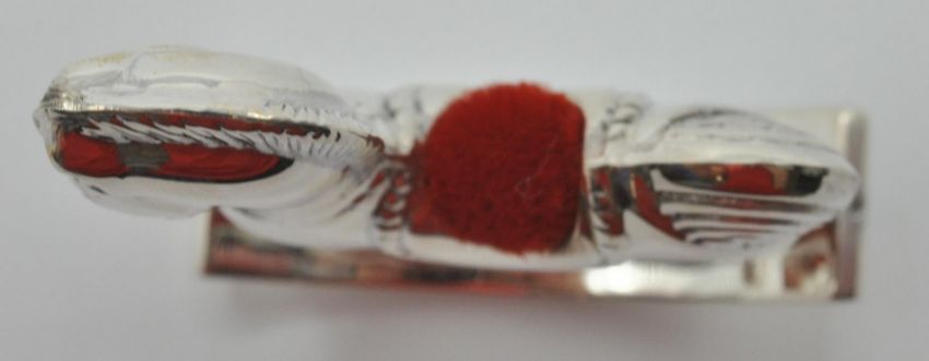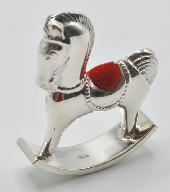 A stamped sterling silver 925 pincushion in the form of a rocking horse with velvet cushion to the saddle. Weight: 24.4g measures: 6cm tall.