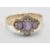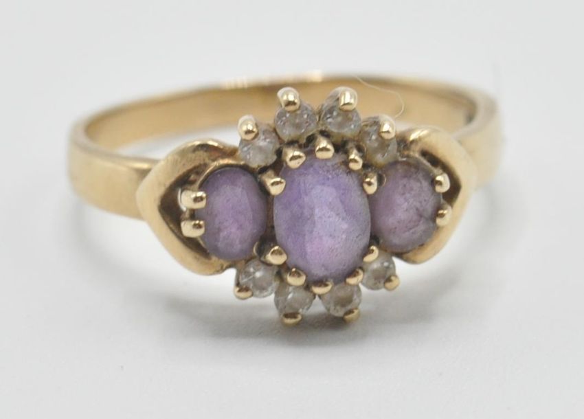 A hallmarked 9ct gold ladies ring being set with three oval cut purple stones with white accent stones to the tops and bottoms. Hallmarked Sheffield 1992. Weight 2.6g. Size N.5.
