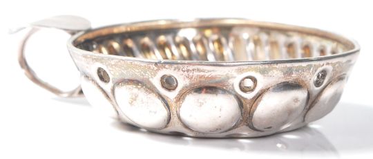 A group of four silver items to include a pair of continental silver ashtrays of oval form having raised scrolled decoration borders (marked to the bowls), a square ashtray with a round bowl and engraved Persian Islamic florals (unmarked but tests as silver), and a silver wine tasting cup with pierced holes (marked to handle). Weight 105.4g.