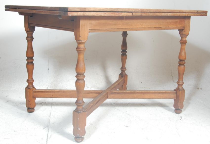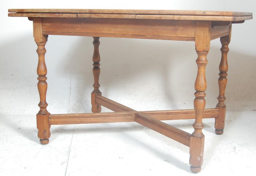 An early 20th century mahogany turned refectory draw leaf dining table. Raised on turned legs united by cross over stretchers having a fitted frieze with extending draw leaves to each end of the rectangular top.