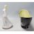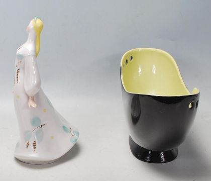 A mid century Retro Russian porcelain figurine of a lady in flowing dress with chintz pattern being stamped to the underside together with a mid century two tone porcelain retro centrepiece bowl vase in black and yellow.