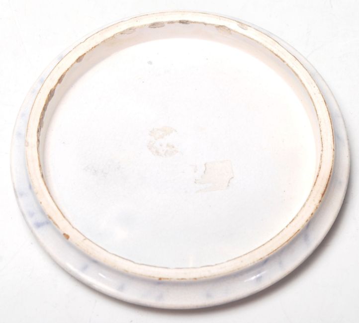 An antique 19th century Victorian prattware ceramic pot lid having a transfer printed Strasbourg street view scene with a marble effect border.