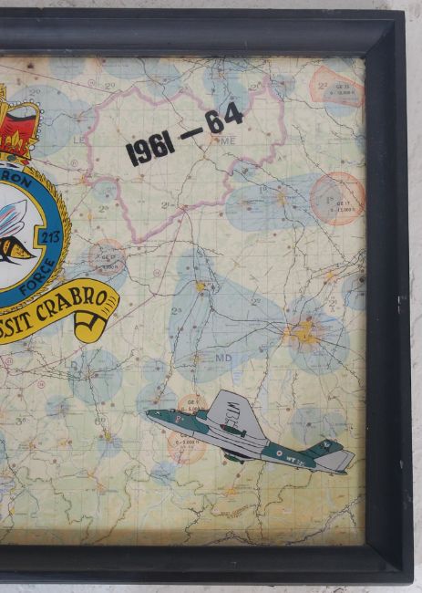 A 20th century c1960's RAF Royal Air Force 213 Squadron painted framed display. The display featuring an original map, framed, with the over-laid perspex reverse-painted featuring the 213 Squadron insignia and depictions of two planes. Framed. Total size approx; 56cm x 78cm.