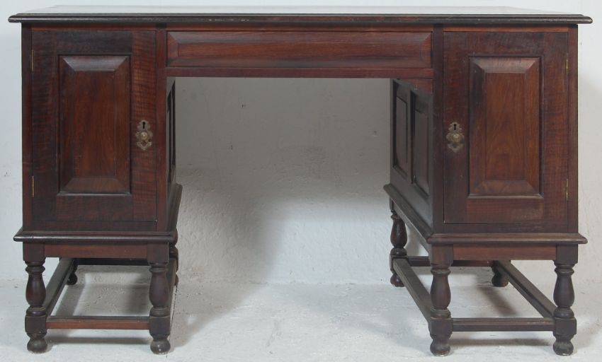 A 1920's Jacobean oak revival twin pedestal partners desk. Raised on turned legs with peripheral stretchers having a bank of 3 drawers to each. Fielded panel sides to each with flared edge desk top set above. Further drawers etc to other side. Measures 78 x 126 x 72cm.