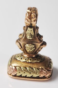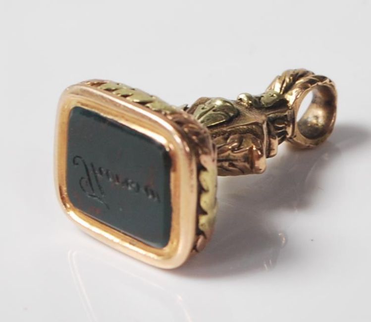 A 19th Century Victorian / early 20th Century two tone 18ct gold fob seal being decorated with foliate detailing with round bale to the top, set with a rectangular bloodstone panel engraved with the name 'Theresa'. Unmarked but tests as 18ct gold. Weight 10.5g. Measures 2.7cm.