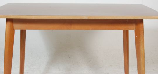 A good mid 20th Century 1950's retro vintage teak dining / kitchen table having a teak wood effect formica top. The table raised on stylish angular splayed leg supports. Measures 74 x 110 x 68cm.