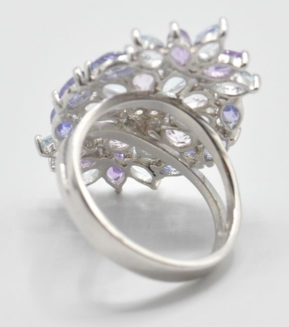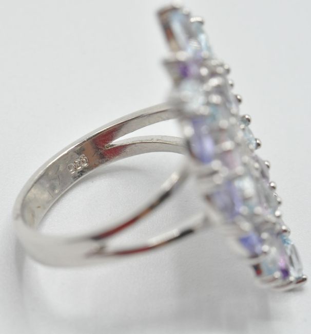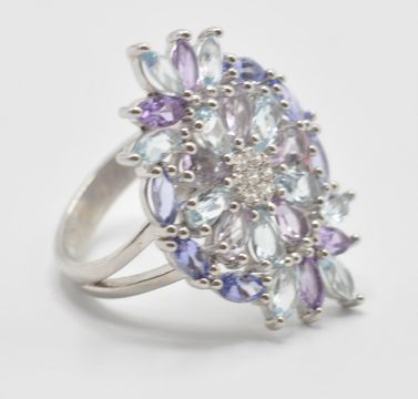 A large 925 silver CZ dress ring with multicolour stones set in a floral arrangement. Size P, weight: 6.20g