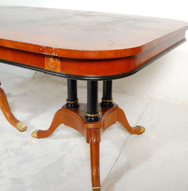 A large impressive regency revival dining table consisting of a maple, satinwood, ebony & boxwood top set upon a pair of triple columned ebonised bases with splayed tripod feed terminating in brass encased claw feet set upon castors. Dimensions are 76cm x 183cm x 115cm.