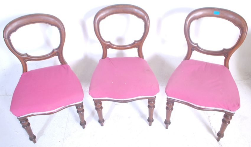 A set of three Victorian 19th century mahogany balloon back dining chairs having scroll carved back, red upholstery overstuffed seats being raised on turn legs. Measures 87 x 52 x 44 cm.